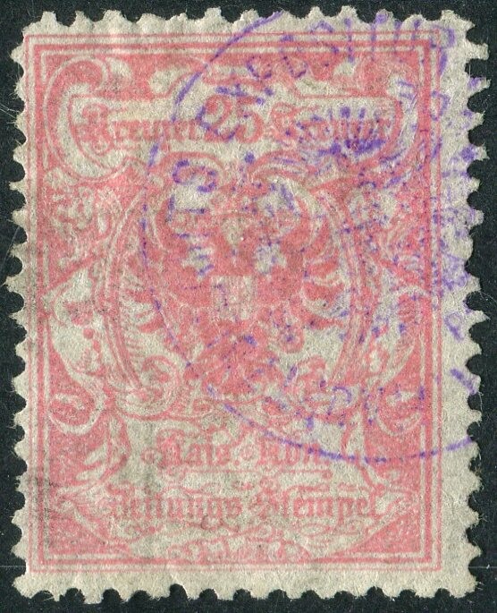 1890 JOURNAL STAMP (026073) Price £75.00 Stock Code 026073 1890 JOURNAL STAMP (026073)25K Arms (SG J.78, Mi 9, cat £375), one slightly short perf top right, otherwise fine, usual revenue "seal" cancel Click image for a larger view of this item... Breadcrumbs Welcome AUSTRIA - SPECIALISED STAMPS & POSTAL HISTORY - FOR SALE Empire - Journal stamps 1890 JOURNAL STAMP (026073)