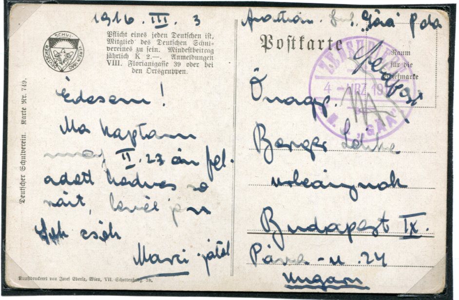 violet circular ZENSURIERT/ S.M. GA(I)A frank cachet on feldpost card to Budapest, 1916